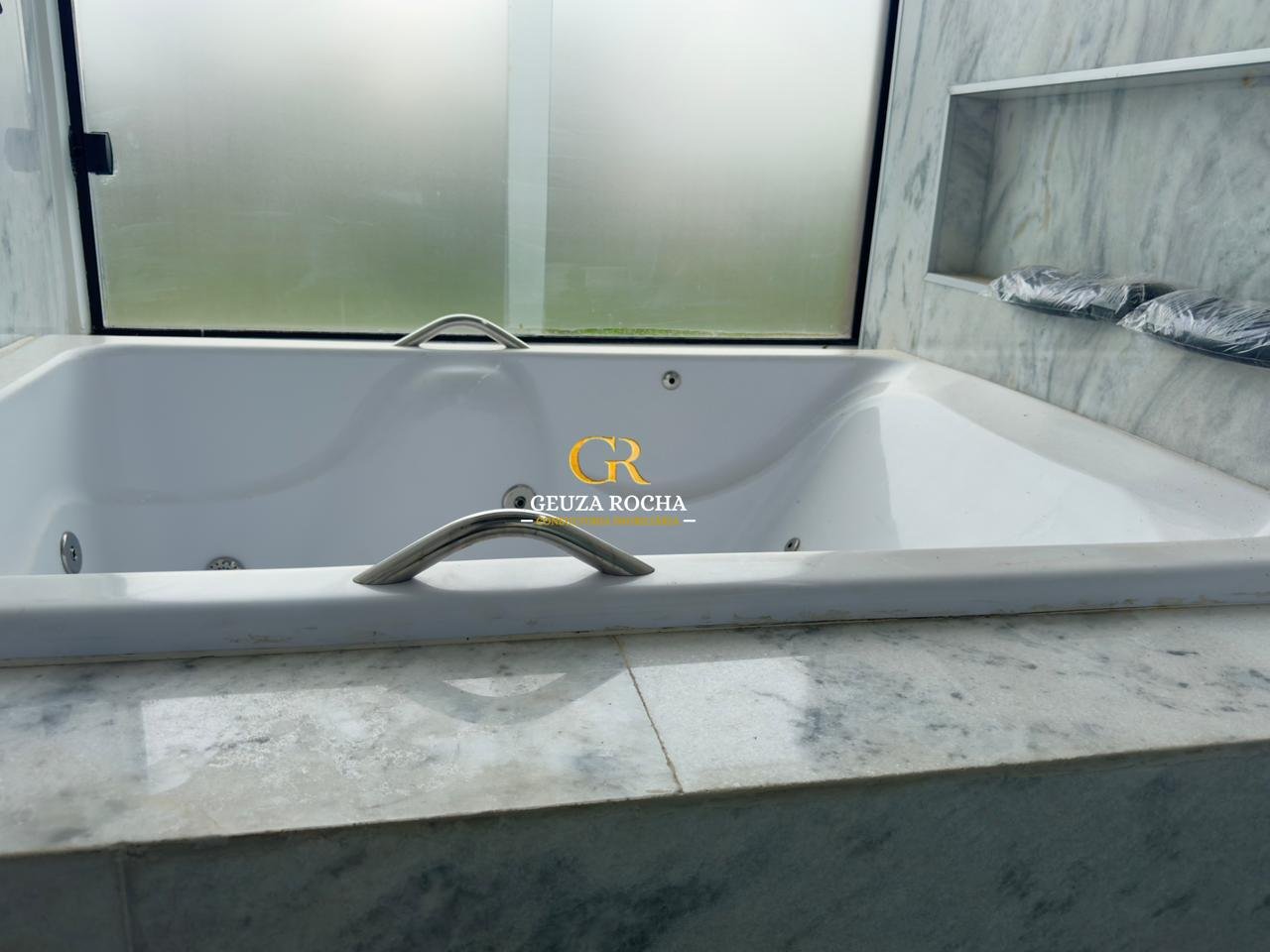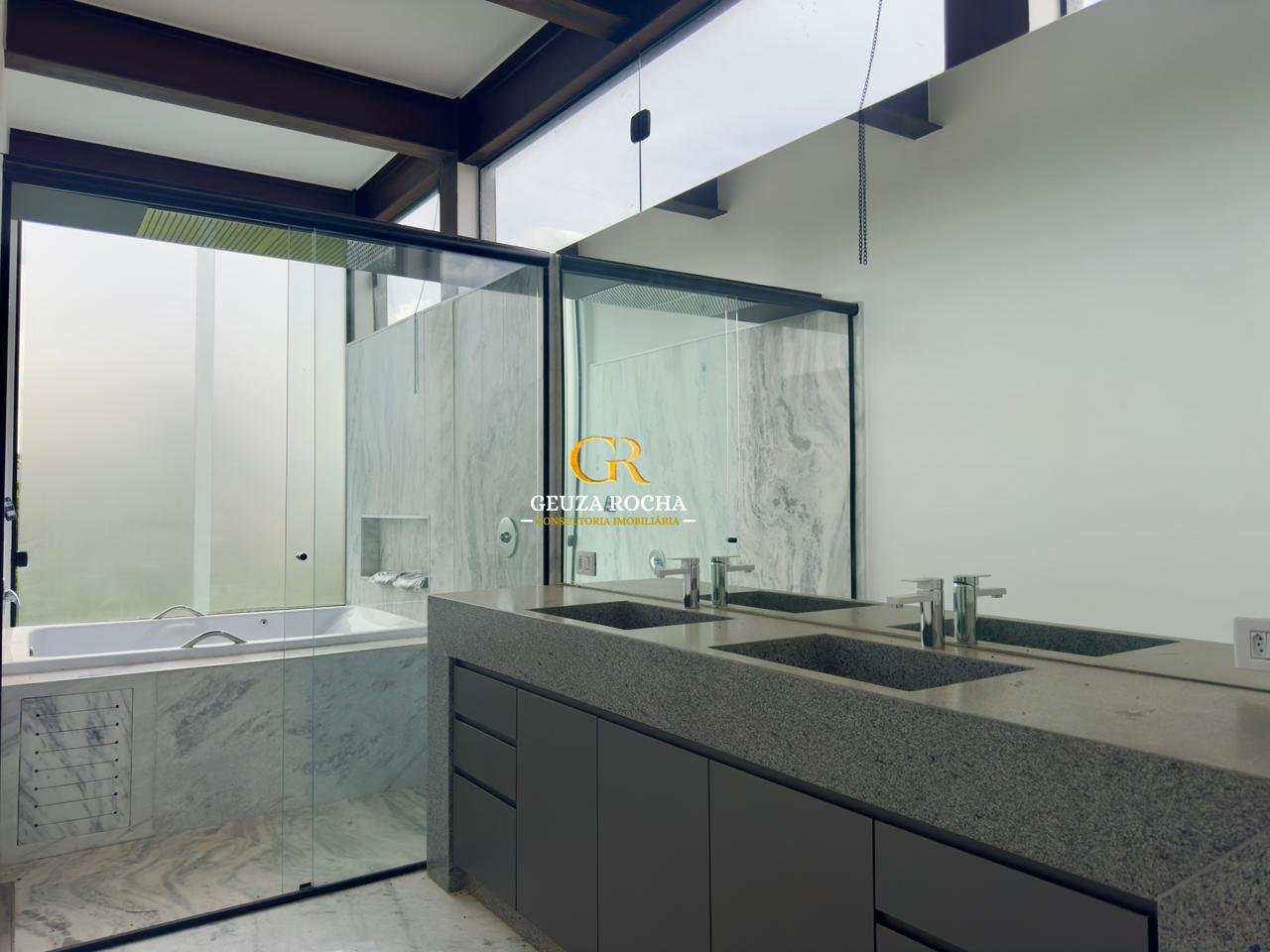 • Suíte Master: Ampla e reservada, com uma vista serena que se conecta visualmente à área externa e à piscina. O banheiro comtempla banheira de hidro, chuveiro tipo cascata