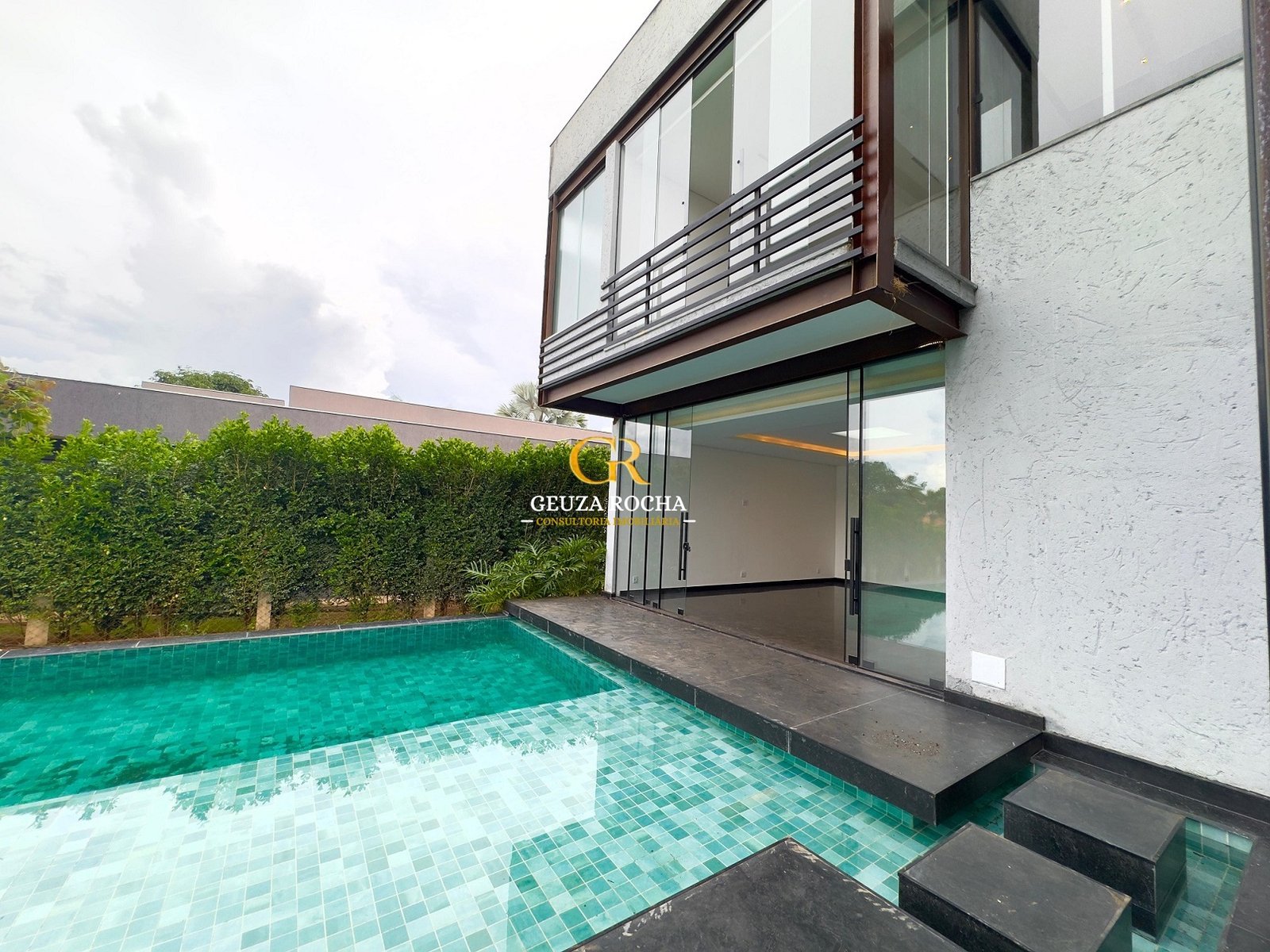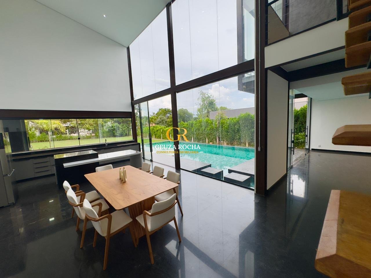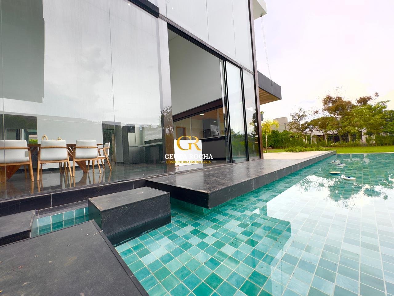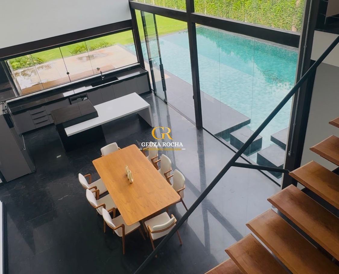 • Piscina de Destaque: Uma piscina com cascata, integrada ao living por um painel de vidro de 6 metros de altura, proporcionando um efeito visual moderno e luminoso.